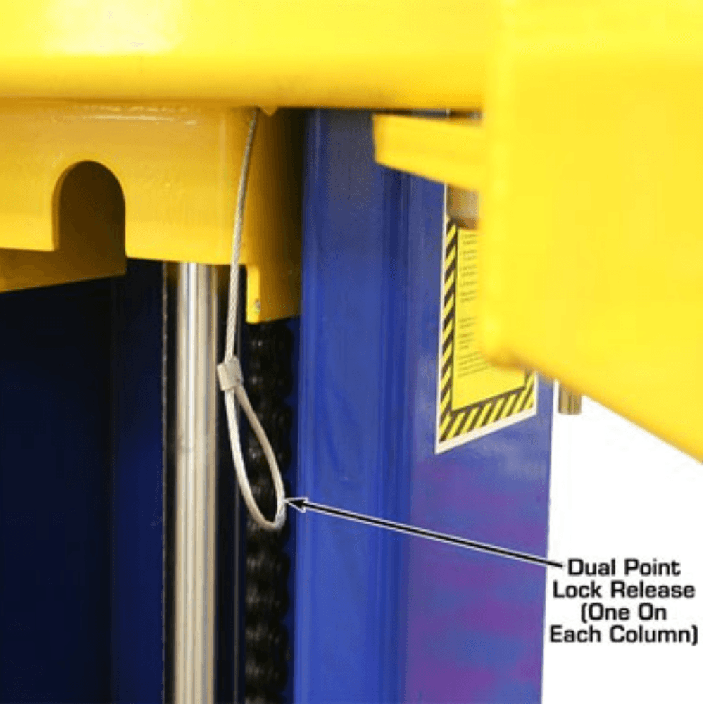 The symmetric/asymmetric arm design provides maximum versatility, allowing operators to position the lift arms to accommodate different vehicle sizes. Additionally, the spring-loaded Secondary Lock System (SLS) automatically engages in case of a slack or broken chain, adding an extra layer of safety.