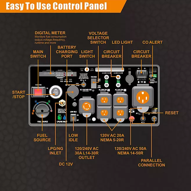 Designed to operate on multiple fuel types, this generator offers flexibility and convenience, allowing you to choose the most accessible fuel source—whether it’s gasoline, propane, or natural gas.
