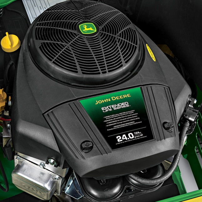 Experience smooth, long-lasting power from the 24 HP John Deere Extended Life Series® (ELS) V-Twin engine with 724cc displacement. This engine is engineered for extended durability and provides plenty of power and torque to handle tough mulching, mowing, and bagging conditions on properties of two plus acres, ensuring consistent performance season after season.