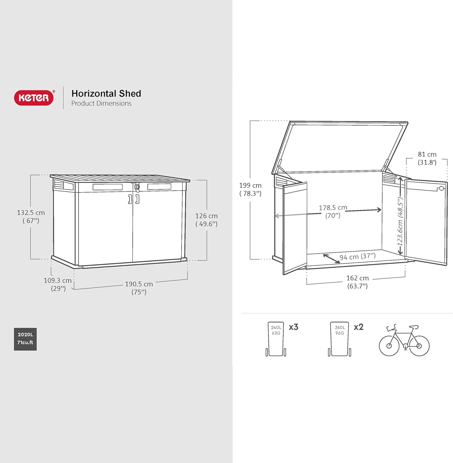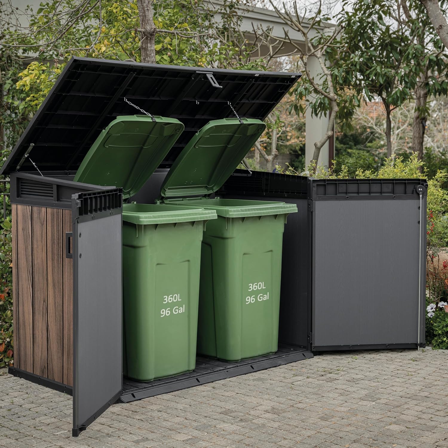 | Bin Capacity | 2× 360L or 3× 240L wheelie bins |