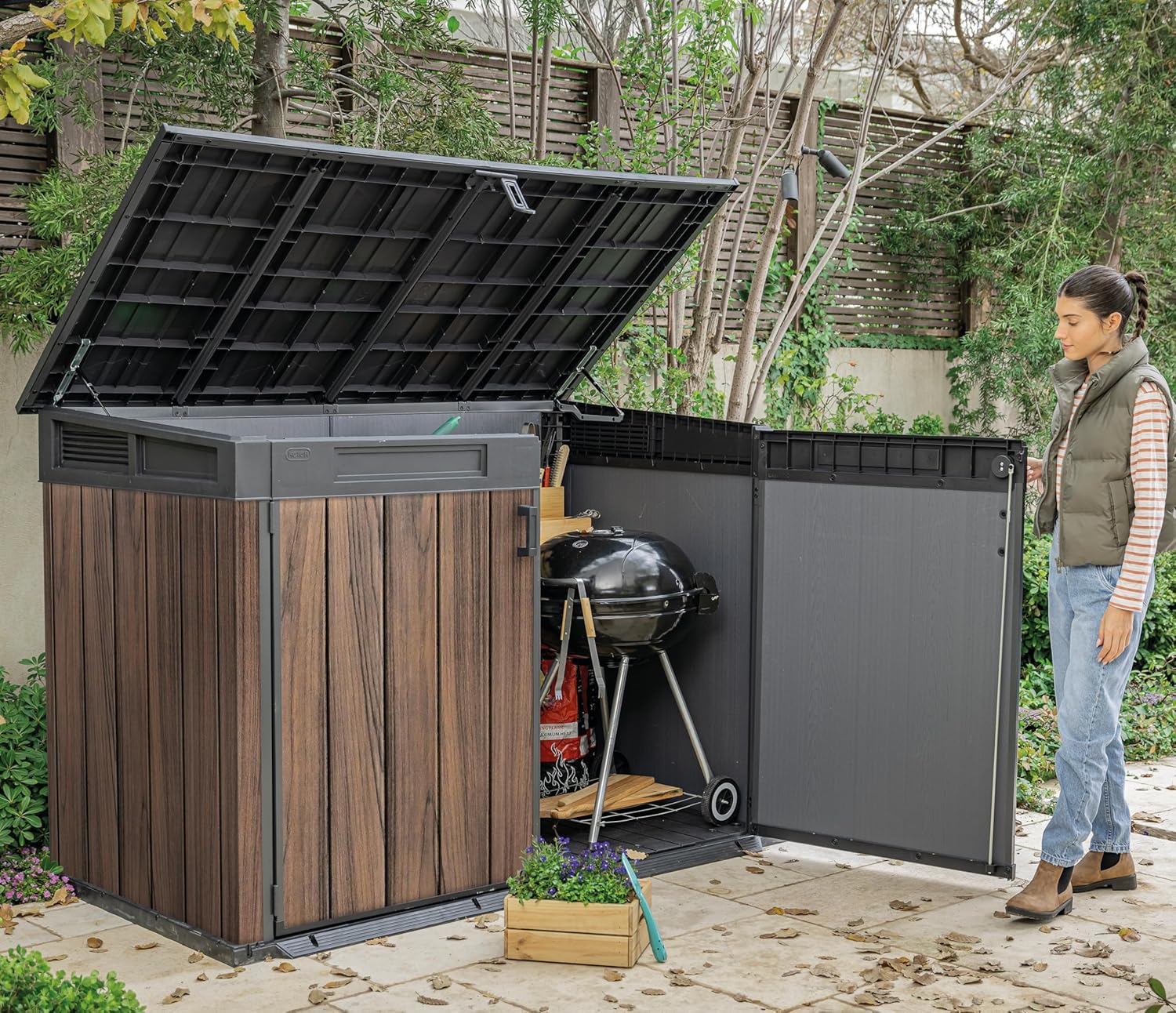 With over 2,000 litres of storage space, the Signature comfortably holds two 360-litre wheelie bins or three 240-litre bins — plus garden tools, BBQ accessories, outdoor cushions, and more. The generous interior means everything has its place.